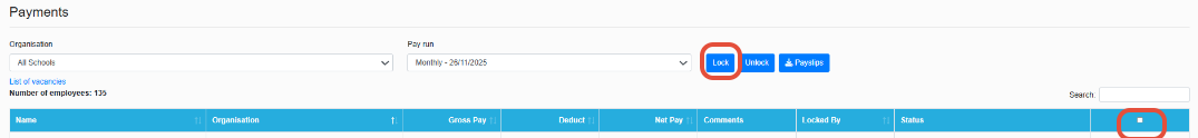 Simply tick each employee OR in bulk by clicking the highlighted box below, then click lock, after locking you will see "pay now".