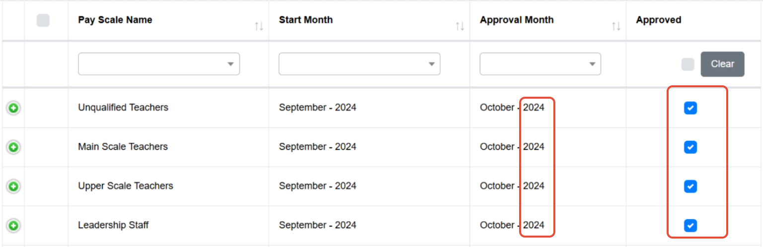 To amend the approval month simply tick on the left of the payscale, then at the top of the page you will see a drop down list named "Approval Month"- once happy you can then click "Update Approval Month".