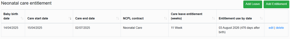 Once the NCPL entitlement is saved, it can be edited or deleted at any point up until leave is taken.