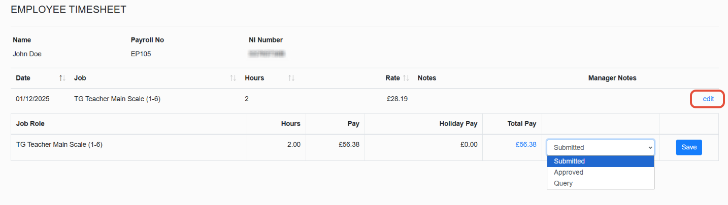 If you select Query, the timesheet will be returned to the employee for review, and will also go into the Timesheets in Query tab on your Dashboard Notifications, displaying a list of timesheets that have been set to query. You can also include a note by clicking edit next to Manager Note section explaining the reason for the query.