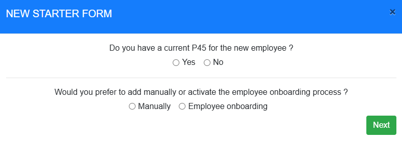 Depending on if you have a P45 for your new employee, the system will prompt either New Starter Checklist information, or request P45 data.