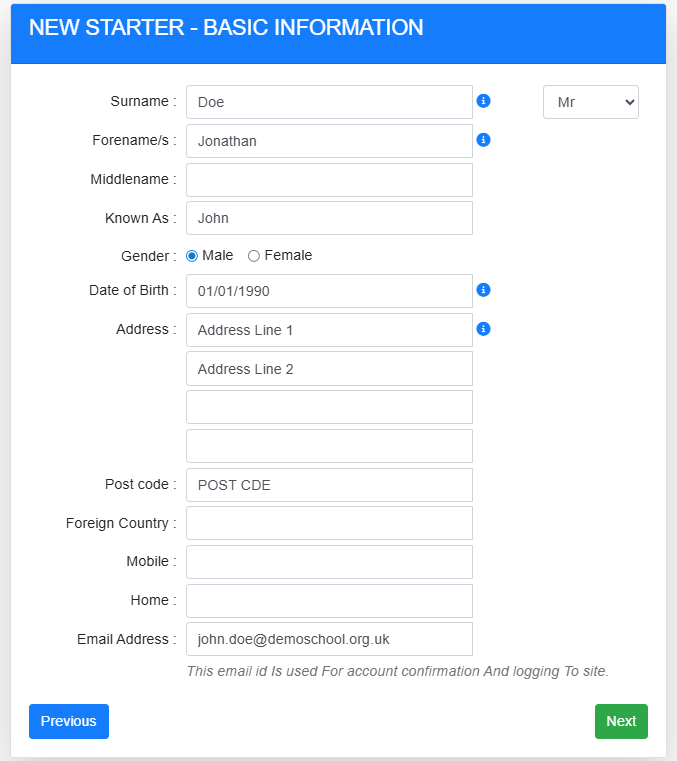 2. Complete the rest of the personal details relevant for payroll processing (All required fields are as filled below):