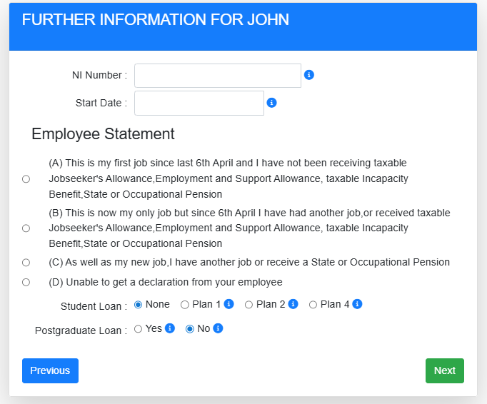 2. You will need to copy the details from your New Starter Checklist including NI. Number, and reflect the answers provided in the Employee Checklist: