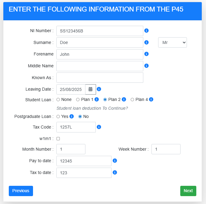 1. Input the relevant P45 information as you have received it, including National Insurance Number, and Previous Pay and Tax to date: