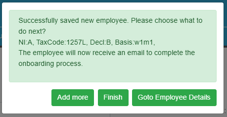 5. When you Submit your onboarding forms, the system will give you a pop-up detailing the tax and National Insurance basis that the system has deemed correct based on the information provided. From here you can 'Finish' which will take you back to your employee list, or 'Go to Employee Details' to view your new record in EduPay.