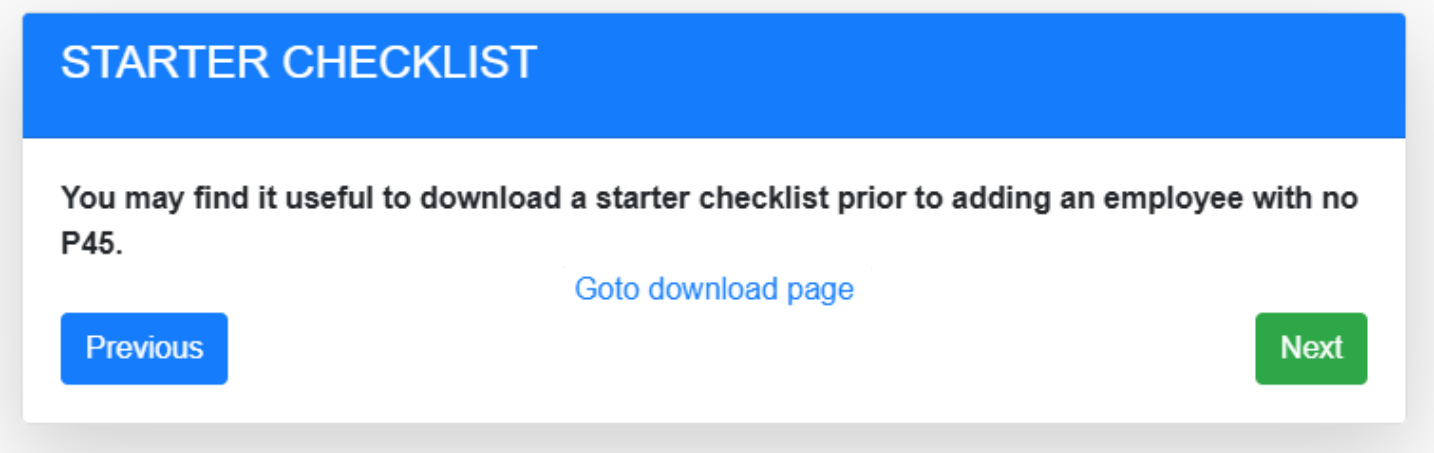 Before beginning to add your new start, the system (if you have indicated that you do not have a P45) will prompt you to download the New Starter Checklist from the gov.uk website.