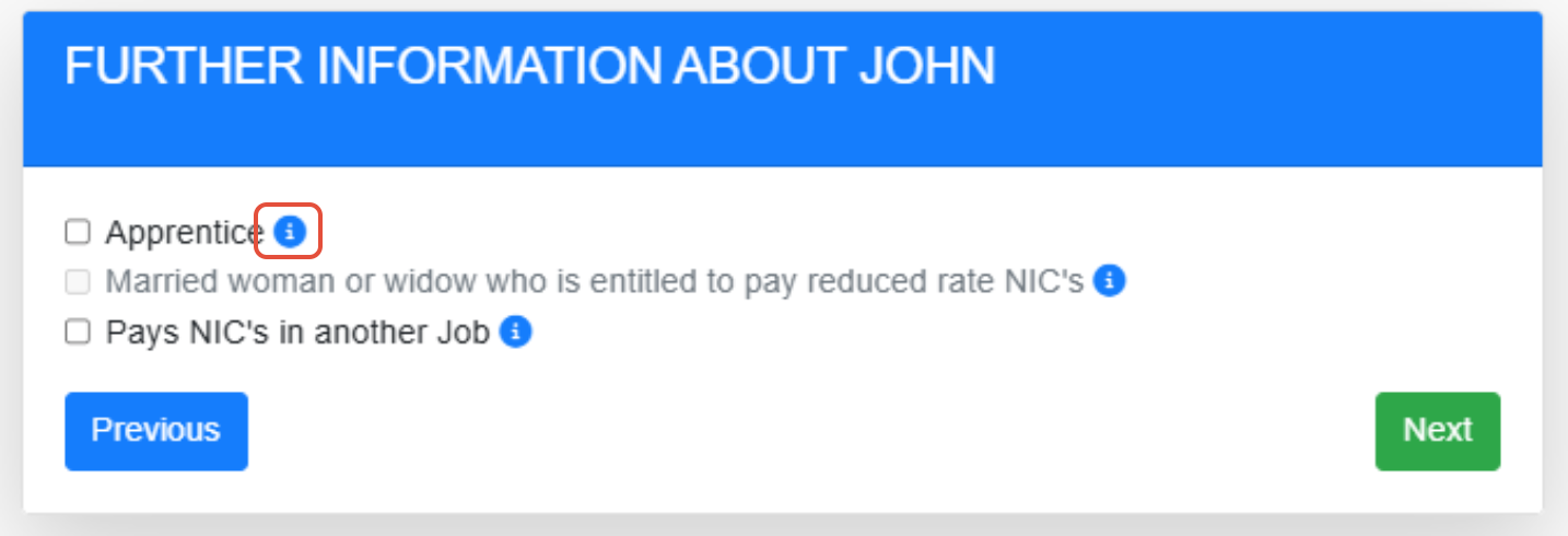 Note: There are small information icons to provide more details on these - if you do not believe any apply, you can leave this section blank.