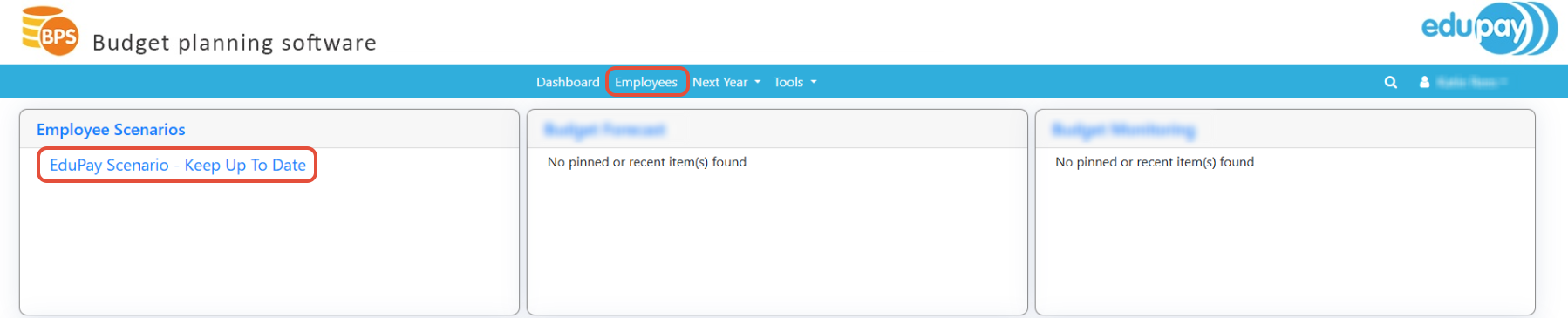 From here, we can either navigate to the "Employees" button at the top of your tool bar, or, you can click straight to your "EduPay Scenario" via your dashboard.