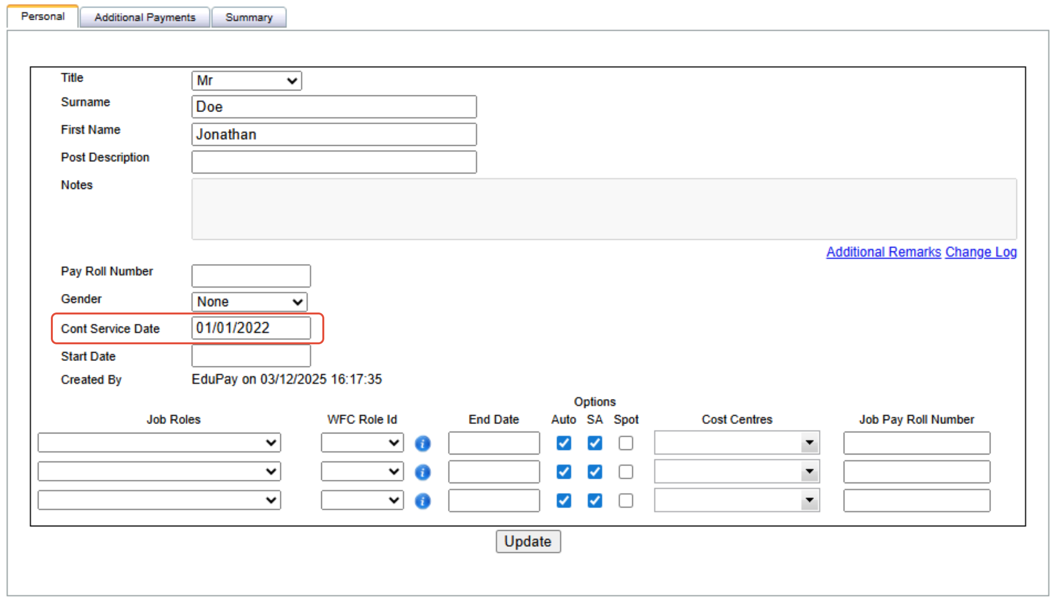 NOTE: Continuous Service Date is automatically populated with the employee start date. If you honour a historic continuous service date from previous employment within your Local Authority, this will need to be updated
