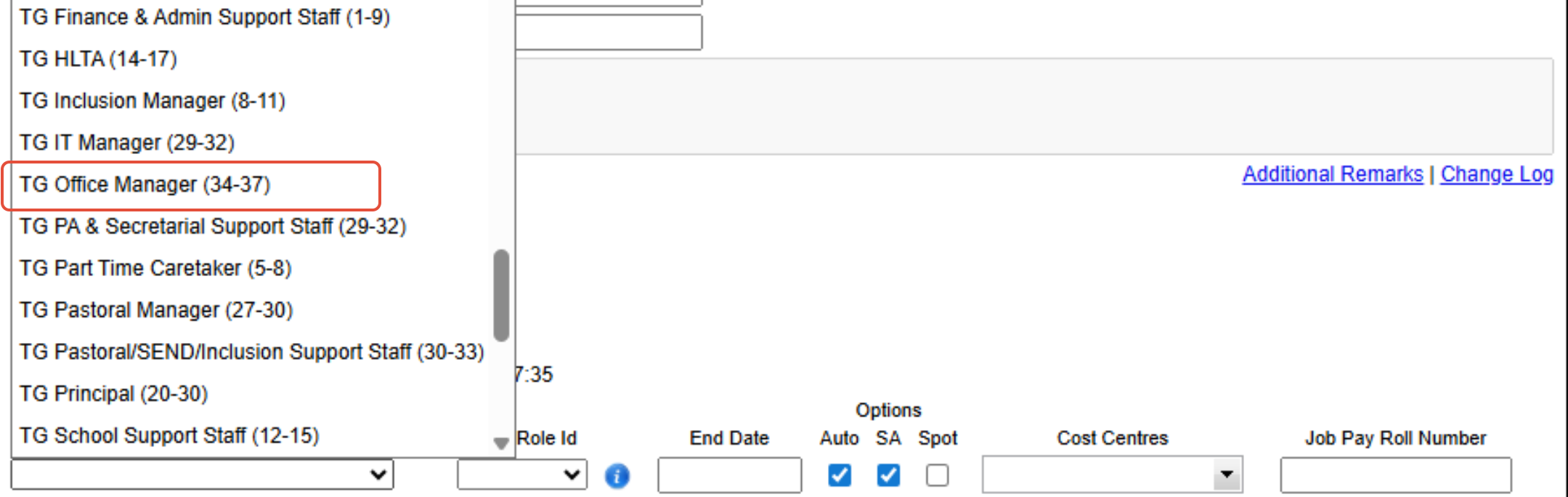 - Pay Scales are selected per job role, and can be specified by grades or other ranges (e.g. Main Scale Teachers), all relevant points available for the job role selected will be available via the Points drop down.