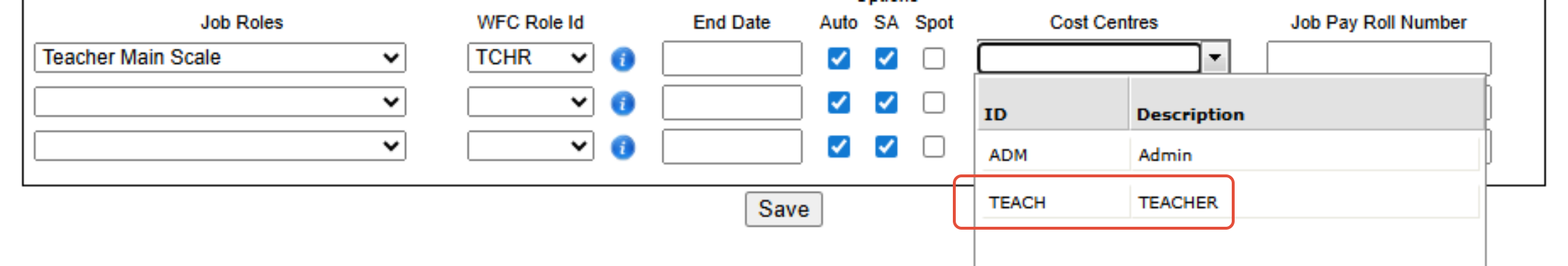 - Cost Centres: Cost centres are applied PER JOB ROLE. If your school uses cost centres, you would select the relevant cost code to the job role - this will be important for your Financial Journals in EduPay