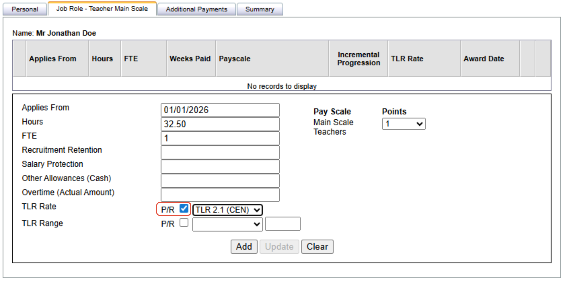 - TLRs can be pro-rata'd via the 'P/R' tick box, this will be pro-rata'd to the contractual FTE. Alternatively this 'P/R' tick box can be unticked, meaning the full time amount for the TLR will be divided by 12, regardless of any part-time contractual hours.