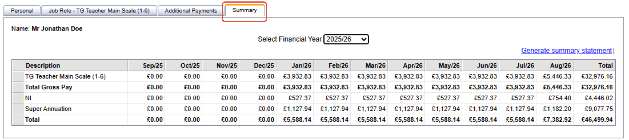 BPS offers a summary tab, so when inputting contractual information you can see a breakdown of how this will be pulling through to EduPay for payroll each month. The figures in the BPS summary will always be as they appear in EduPay for payroll: