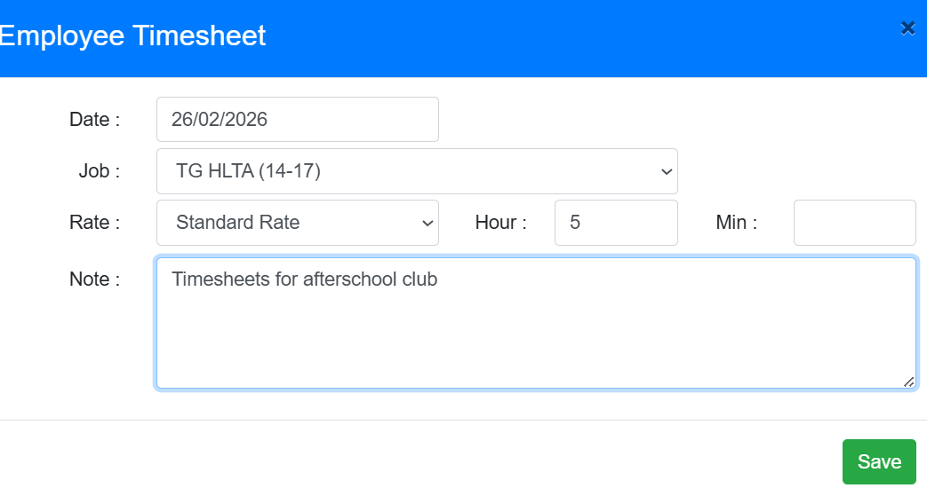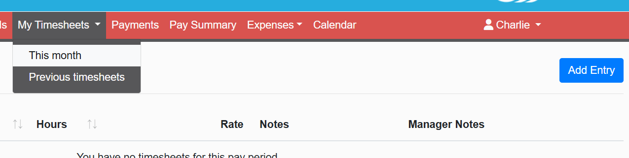 After selecting add entry you will be able to add the hours for the timesheet, the date it is for and the job role the timesheet is allocated to, after saving this will go to your manager to approve.